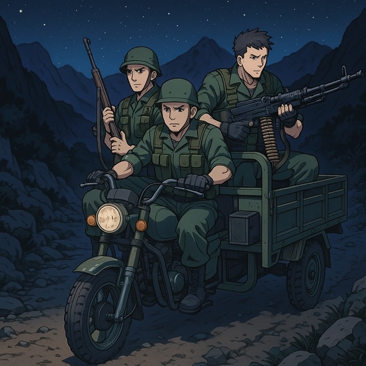 山内得意洋洋的开着摩托车,两个队友坐在上面。一队友架着机枪不停的射击,一队友用步枪射击。