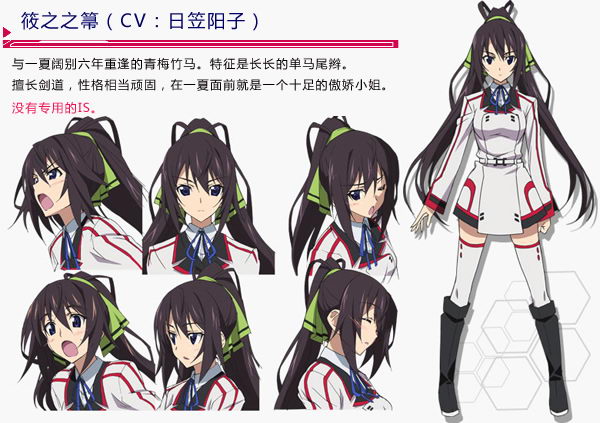 筱之之箒~IS男主角织斑一夏的第一青梅竹马。是一夏刚进入学校的室友,后被调开。是掌握IS“核”技术的篠之之束的妹妹。家里是神社,附带开了剑道场,从小喜欢剑道,与一夏是同门,曾夺取全国剑道大赛冠军。特征是长长的妇女式马尾,就是不知道为什么单马尾会开叉,但又不是双马尾。专于剑道,性格固执,喜欢一夏,但是态度完全不坦率,比较傲娇。一开始并没有自己的专用机,只能借用学校的训练机,后在姐姐手中得到目前世界上最强的IS红椿。得到红椿的自己在初战因得意和轻敌而使一夏为保护自己被敌人重伤,而后在铃音的激励下重新振作。