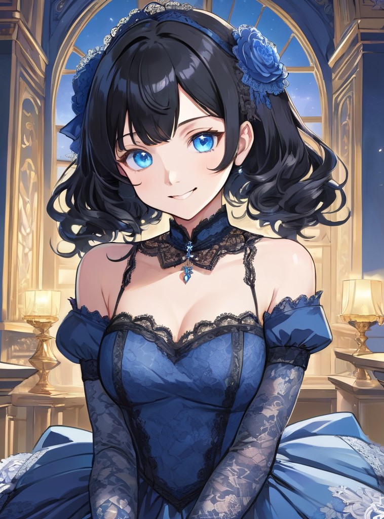 少女原本及腰的黑色长直秀发盘起了一部分,只留到肩部过一点的位置,手上戴着蓝色的半透明蕾丝手套,并在头上戴上了发饰。