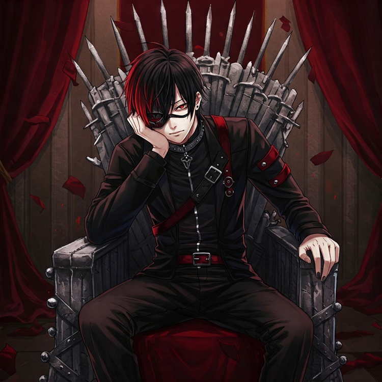 男子的头发不长,戴着一大块眼罩遮挡起包括右眼在内接近四分之一的脸,左眼呈血红色的瞳孔看上去如同是石榴石一样明亮通透,左耳耳垂上吊着一个菱形耳坠,数量恰到好处同时又不过分华美的饰品,配合如鲜血般的红及深邃至极的黑搭配起来的衣着,再加上其英俊的外表,令他从头到脚都散发出一股邪魅与霸气。