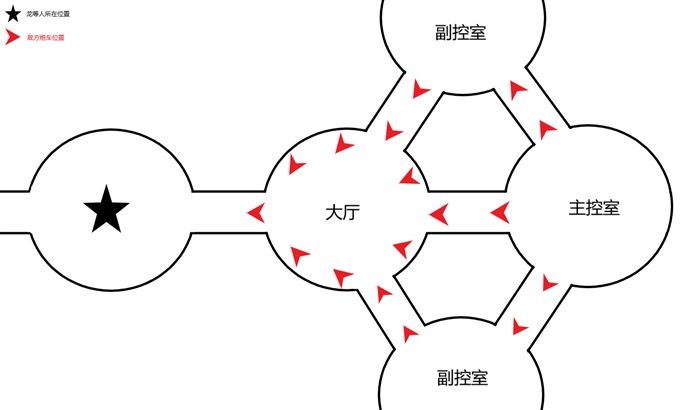 根据地图上的显示,在这条直线上有三辆炮车,中间会经过大厅,终点是主控室,如果一炮打通的话,通过这条道路就能直达控制室。