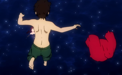 随后,那绚丽的焰火再次升起,光芒布满了整个天际,但是对于已经进入过五维空间,穿梭于过去,现在,未来之间的典道与奈砂,欣赏过的烟花已经不再觉得那么好看,这个时候,典道也趁机脱下了上衣和鞋子,向水中的奈砂飞奔去,但奈砂却再次潜入水中,典道寻找着奈砂。