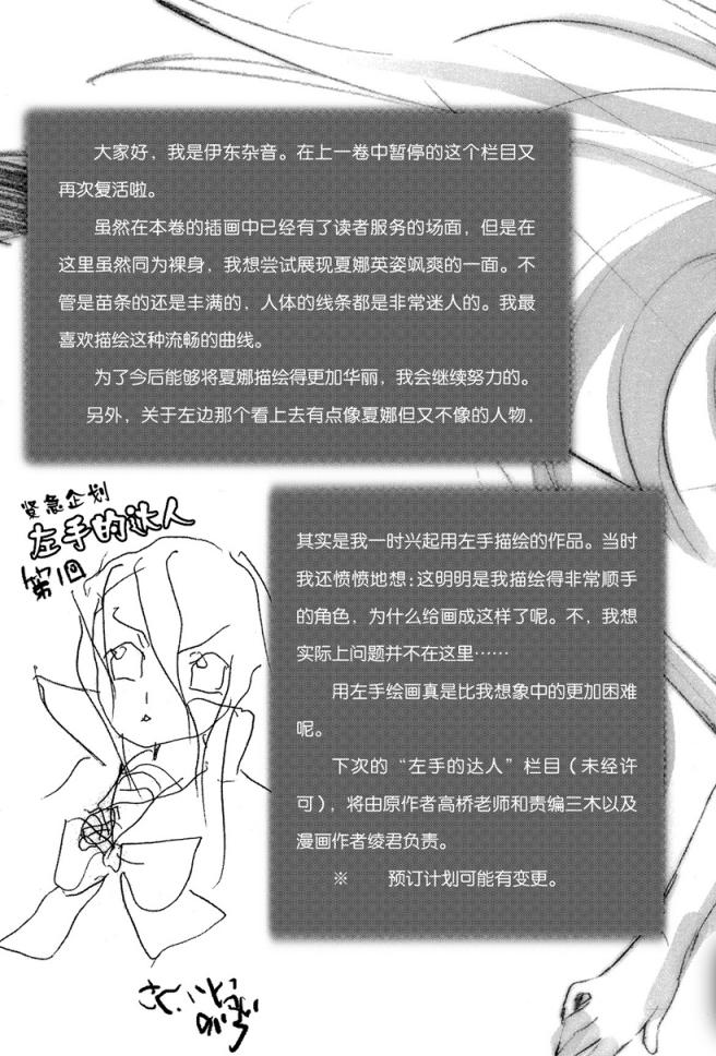 责编三木老师,是一个不知道停止的人。我真是非常担心他会突进得太过深人。这次也是,关于那件事情究竟应该描写到何种程度,我们之间展开了手里剑乱飞的忍法合战(以下省略)。