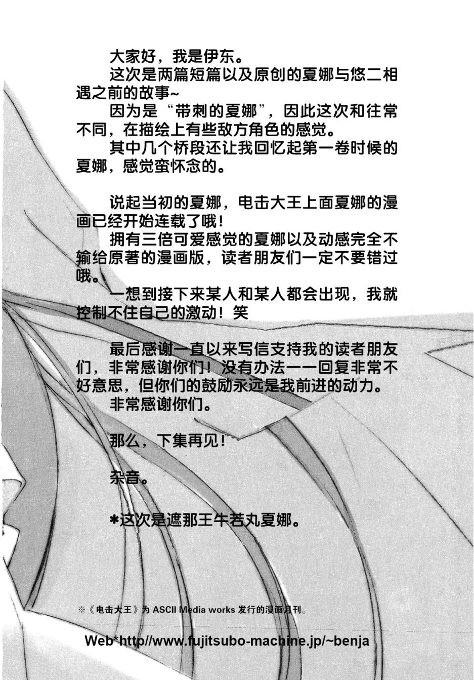 负责插画的伊东杂音老师,是一位能够画出充满魄力作品的人。特别是在上一卷中,在我希望的地方都画了插画给我,就我个人来说也非常满意。在伊东老师本业逐渐繁忙的时候依旧对鄙人不离不弃,这次又对拙作给予了极大的帮助,对此深表谢意。