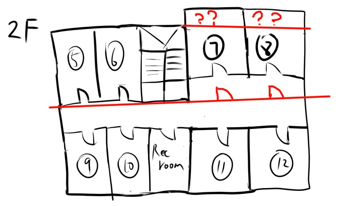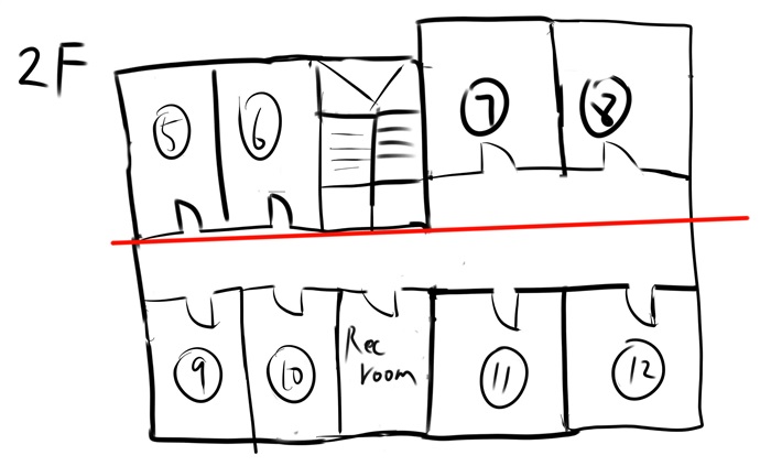 他作出如此判断的依据则是来源于地图的作画失误,“从平面图上看,五六号房和七八号房并不在一条直线上对吧。”他拿出一支红笔在地图上画了起来。