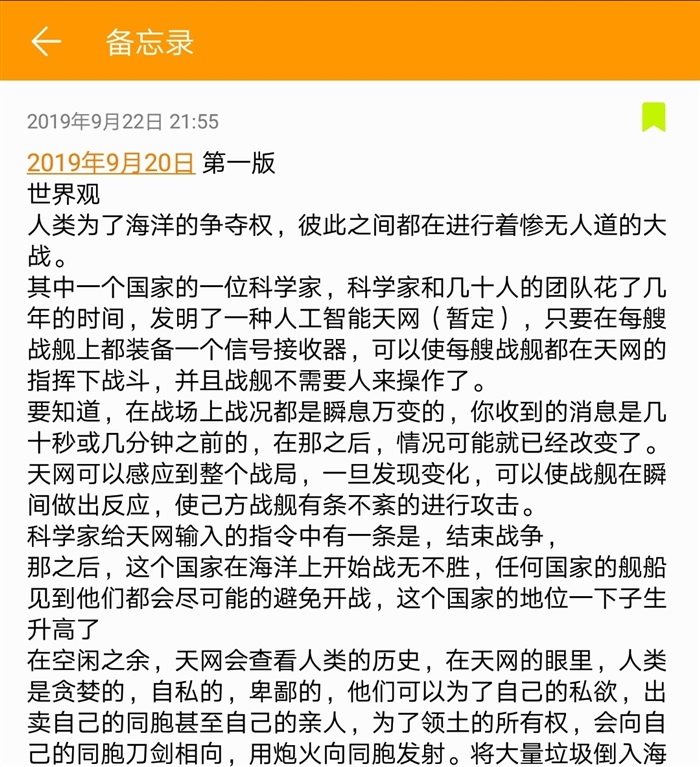 10月初的时候我开始写剧情了,由于是用手机备忘录写的,不太好用,所以我在10月底的时候就用幕布写了。