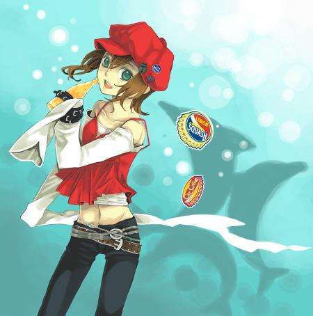 相当与夏季相称的一身服装,头上还戴着一顶红色的帽子,和红色上衣刚好相配。