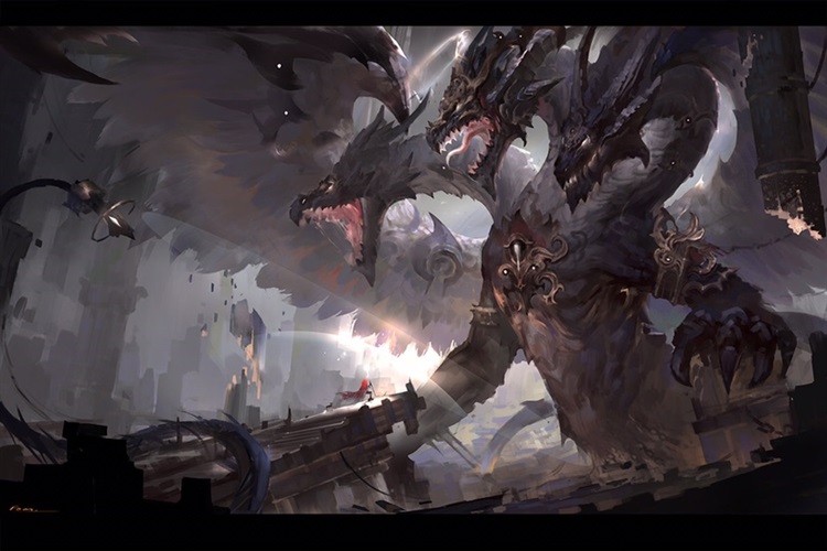 这传说中的神『濴』,有着一对巨大的紫色翼膜,以及三只各不相同的龙头。左龙头覆盖着银色的鳞甲,嘴中漂浮着蓄力已久的冰冷蓝色魔法冰球,眼中是代表坚毅的蓝色眼瞳。向另一边看去,右龙头的头上戴着几片熔岩长角甲,嘴中闪烁着金色雷光,眼中是代表财富的金色龙瞳。而那中间的龙头上,前鼻上,眼睛前,戴着一副圆框老花镜,嘴上叼着一只漫着烟气的大烟斗。