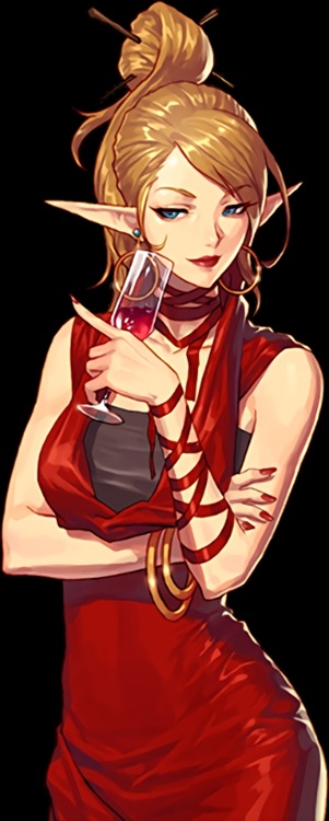 索西雅穿着大红色的紧身袍,举止优雅,带给人一种成熟的美。与她对视时,那蓝色的瞳孔仿佛承载着一片悠远的海洋,看不到尽头。尖尖的耳朵耳朵表明了她并非人族的身份。
