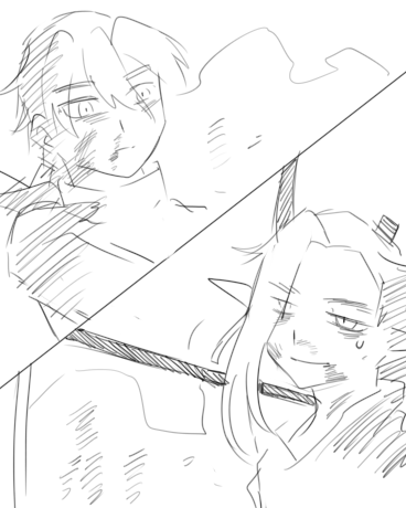 黄发男子直挺着站着,拿着一把锋利无比、浑体乌黑的、能够证明他身份的剑——这是历代勇者相传的、不知用什么材料做成的剑。剑的前端抵在了跪下的男子的脖子一侧。只要勇者愿意,下一秒,这个男子的灵魂将获得解放、归于天际。