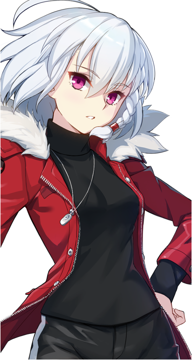 白发少女穿着鲜艳的红色外套,嘴唇边比着一只口红,面带微笑。