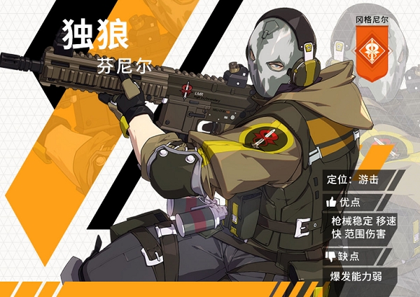 大招:呼叫飞狼,在指定位置呼叫一台强大的无人机,可以为范围内的队友提供治疗,并使用机枪攻击附近的敌人。