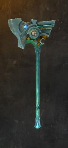 激战2传奇大锤—沙鲁尔,一把墨绿色的双手大锤,极度沉重,锤头还有一个奇怪的机械结构。我感觉嘉莉娜要想熟练使用这把大锤得需要很长时间。
