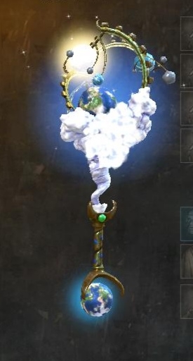 我给阿芙罗拉的是一把手杖,激战2传奇手杖—天仪,如同一个地球仪一般,上面还点缀着朵朵白云。