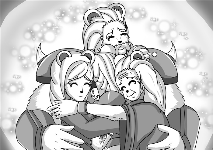 当天晚上,艾雪家里比昨天还要热闹,艾雪与父亲畅快对饮,两人都喝得都有些迷迷糊糊的,凯文也被醉酒的艾雪拉着灌了几大杯果酒,站都站不稳了。马库斯则放声歌唱马拉斯大雪山的民谣《雪山之民》,所有人都跟着唱。此时在屋外不远的一个小山包上,雪山神正在和一个男性白熊族老人的灵魂,透过窗子看着屋子里的一切。