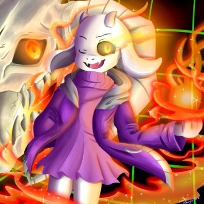 他看见一头羊类魂兽手上燃烧着熊熊的火焰,而她本人的左眼也是燃烧着火焰。她穿着紫色的连衣裙(大概是),正咧开嘴角微笑着看着他。只见她身后的巨大羊头骨毫无征兆地张开嘴,凶戾的双眼燃烧起火焰,从口里发射出一道白色的激光,赵无极很轻松地躲开了。(图如下)