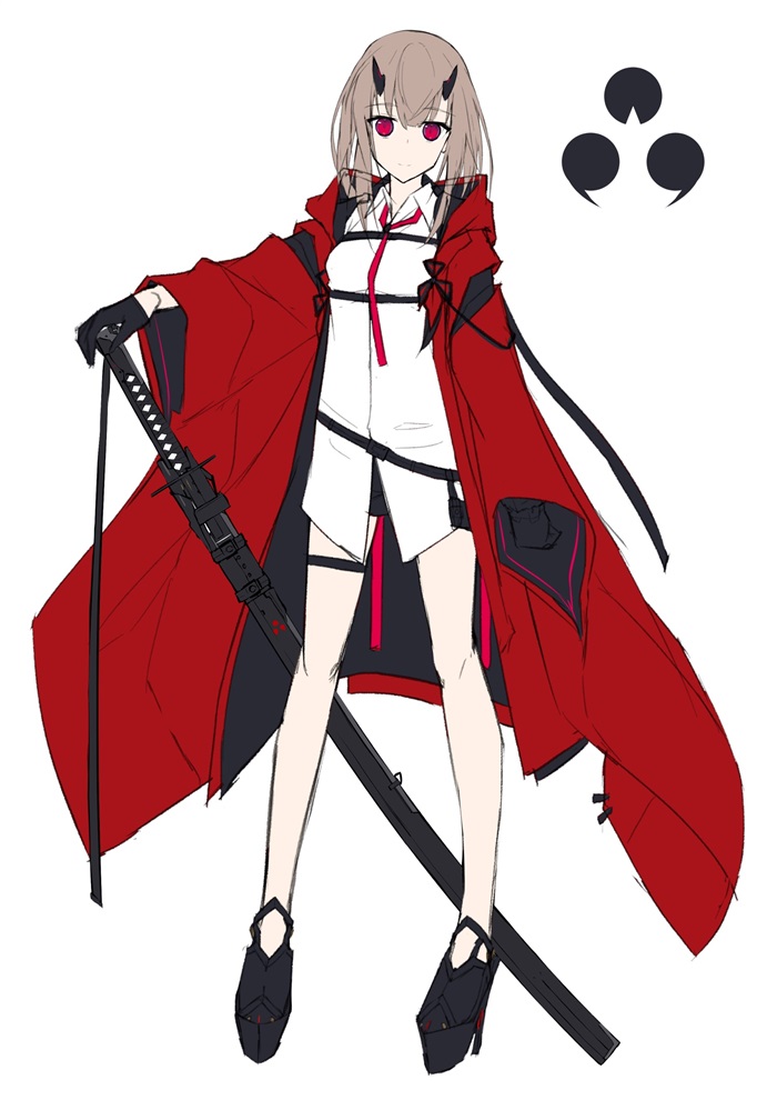 两人回头看去,一位身披带有和式特征的红色长袍、腰挎一把半人高长刀、留着及肩茶色中长发的女性正站在那,朝两人露出友善的微笑。对方前额上那一对黑色的短角和血色的竖瞳都显示着一个事实——这是一位鬼种亚人。