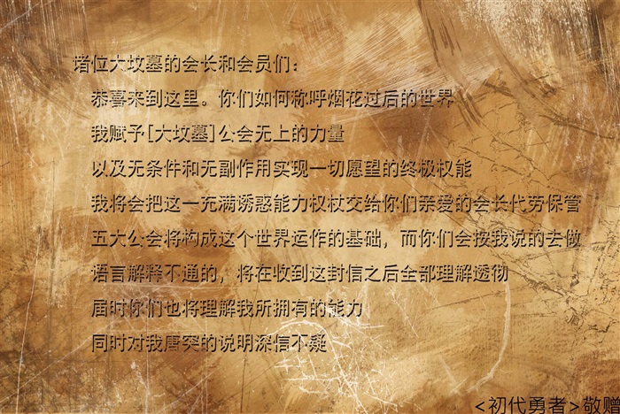 五大公会分别为:[爷、皇族]、[国服最强]、[奶妈天下第一]、[洛羽]和我们的[大坟墓],邮件是「初代勇者」分发的,我们也知道了「重启的新世界」想要我们做的,就是让我们五大公会每个会员都参与其中,加入到这个世界的历史进程,并努力引导其走向繁荣。