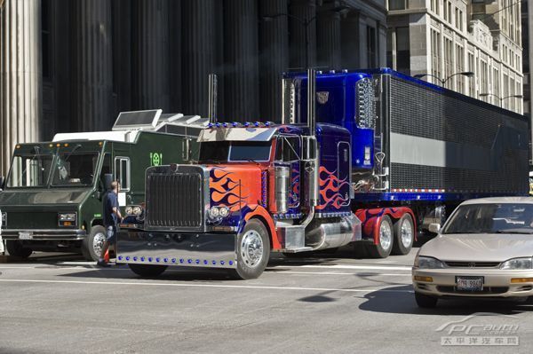 远处,一辆红蓝相间的大卡车冲向了这个街道(大概就是这个样子)。