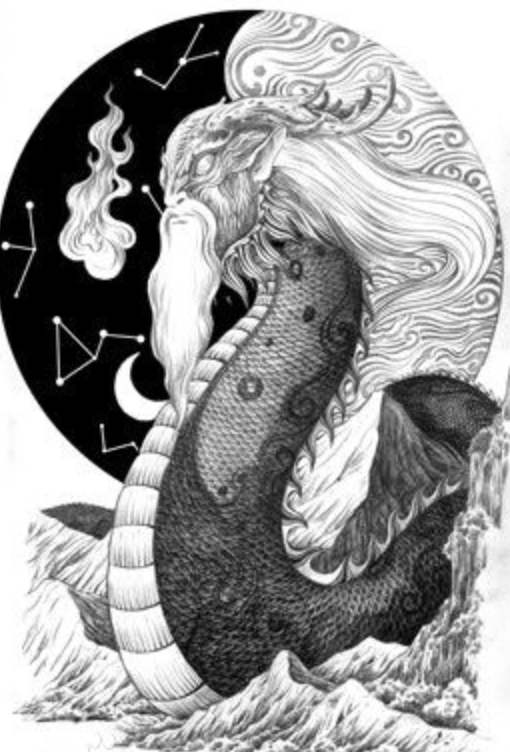[长得像人面蛇身,全身彤红,身体长可达千里,它双眼眯成一条缝,它一闭眼天下就是黑夜。他能照亮一切幽暗之处,这便是烛龙。]