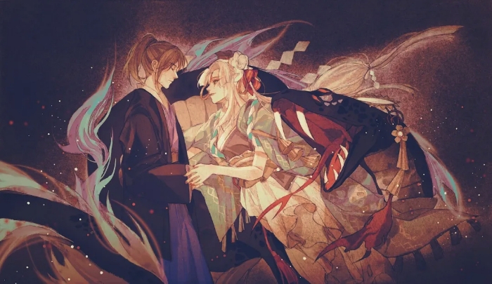 恍惚中,清姬好像看到了那个熟悉的身影在慢慢地远离自己,从前的欢声笑语如幻灯片一样一张张闪过,心底好像有什么东西碎掉了,她痛苦的闭上了眼睛。小清的蛇尾轻柔的将清姬托起,“小清,”清姬抱住了那巨大的蛇身,泪水滴在了那光滑的鳞片上,在她还是一个人类女子时,她是那样的讨厌蛇,那密集的鳞片,泛着诡异的亮光,以及那滑腻的触感。可是在那天之后,她不得不接受变成妖怪的自己,每次蜕皮都让自己痛苦难忍,看着那鳞片从边缘开始逐渐干枯翘起,像一件又脏又破的衣服披在身上,不得不费尽力气才能将它扒干净。