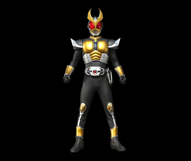 身体套上一套暗金色和亮银色的半身铠,双肩有着翘起的如飞檐般的甲胃,头部有一对向里弯曲的尖角,整体造型看起来和Kuuga有些像。