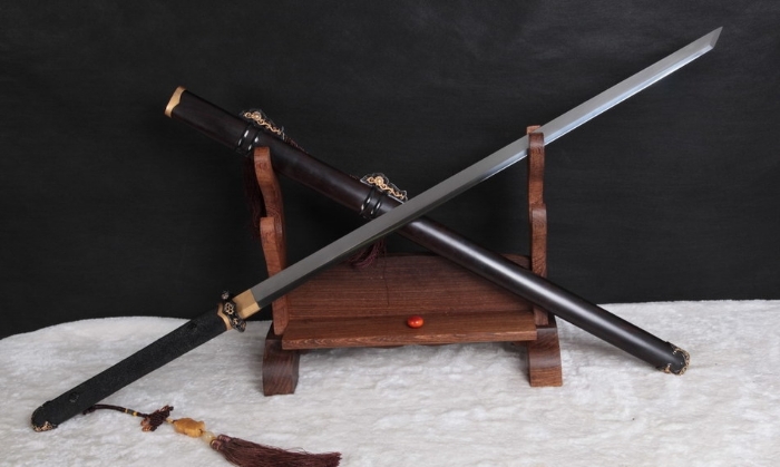架子十分朴素,是纯色的,唐刀放在上面也没有豪华的感觉,唐刀本身也是极为朴素的,但是两相叠加,就有一种肃杀之气,架子的红色仿佛是刀中弥漫出的血气。
