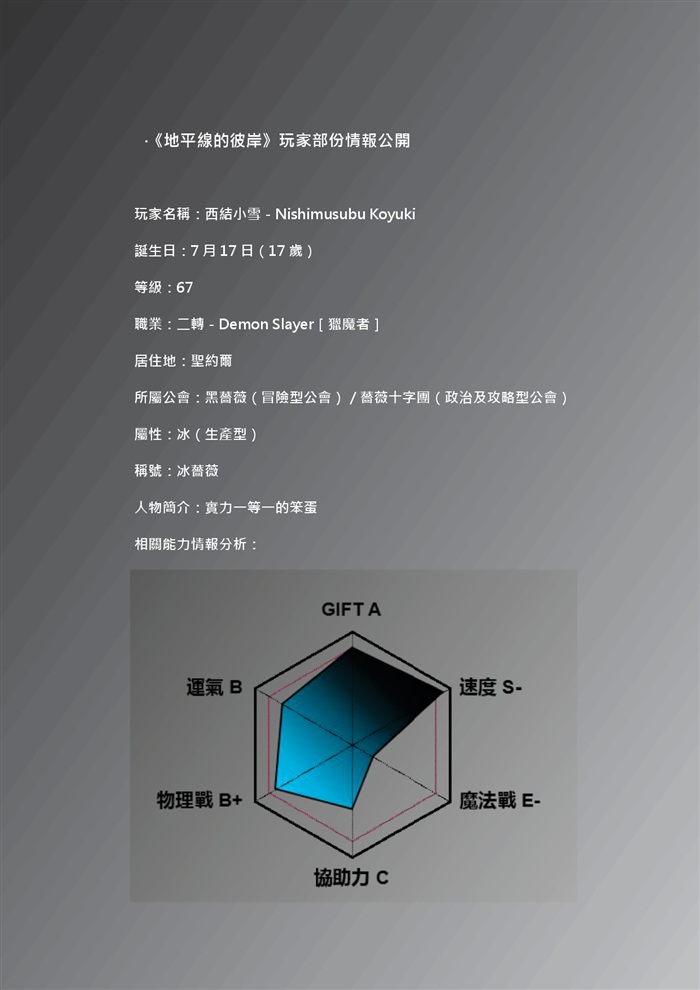 我:「嗯,我會信的,我當然會信吧,妳也……當會說『能』,我明明很清楚的……因為我早就沒有選擇的餘地了。呼——小雪,GM特別給了我一個任務。」