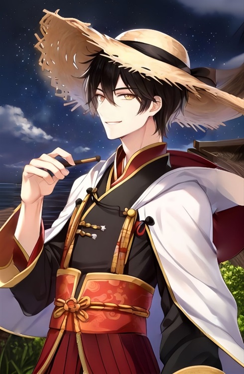 “正是江南好风景,落花时节又逢君,百年了呢,好久不见呀,柳德米拉还有克莱”一个带着草帽、穿着黑色内搭和白色披风的中式服装,有着金色瞳孔留着黑色短发,面容和蔼亲切的男子笑着对柳德米拉和克莱打招呼。
