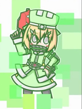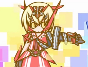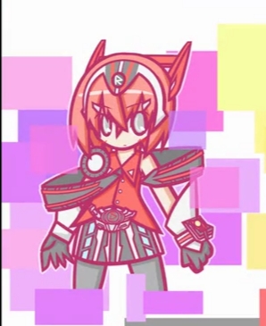 少女有着一头红发,有着一双浅灰色的眼睛,额头上有着一个三角形的红白相间的头饰,头饰上有一个“R”标志的半立体徽章。耳朵上有一个红白相间的奇特耳机。上身穿着一件红色为主,在一些部位有着黑色点缀的连衣裙。脖子上系着一条与轮胎极为相似的带有红色条纹的领带,领带斜套在身体上。下身穿着一条黑色长裤在膝盖和小腿处分别有白色和红色的装甲。脚上穿着一双红黑相间的鞋子。
