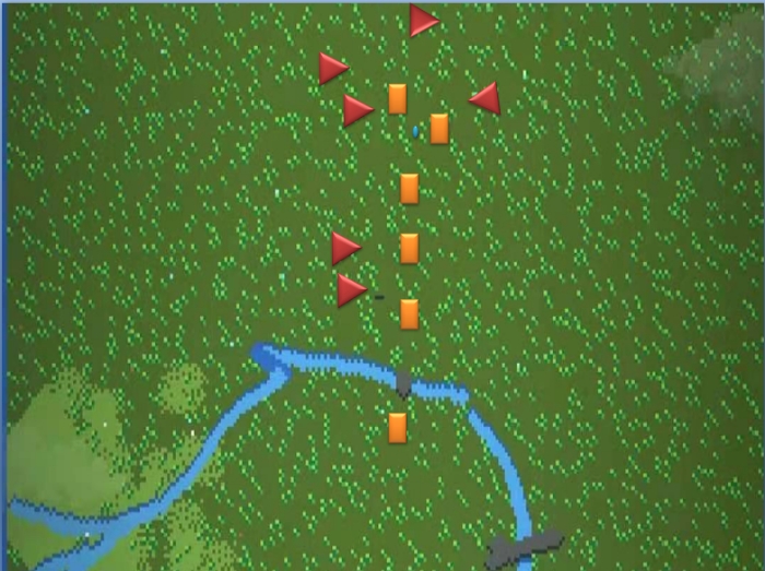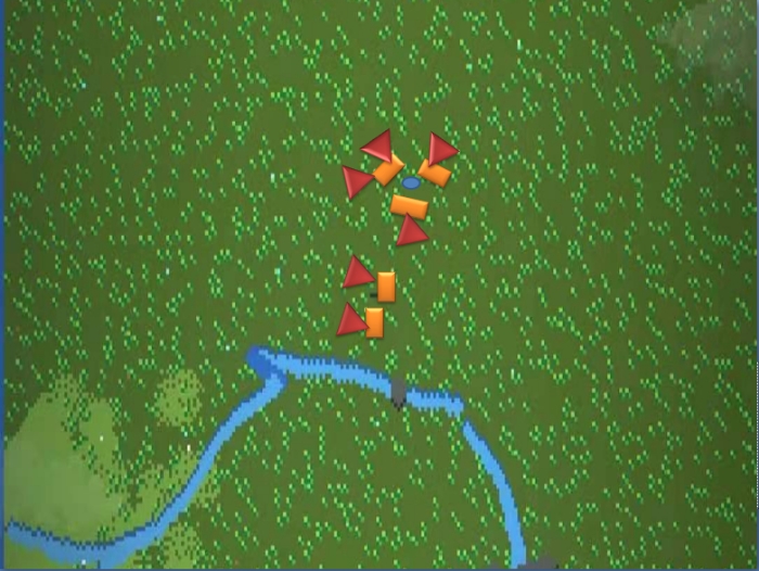 (以上为战争军事分布图,橙色为我方,红色为敌方,蓝色为主角位置)