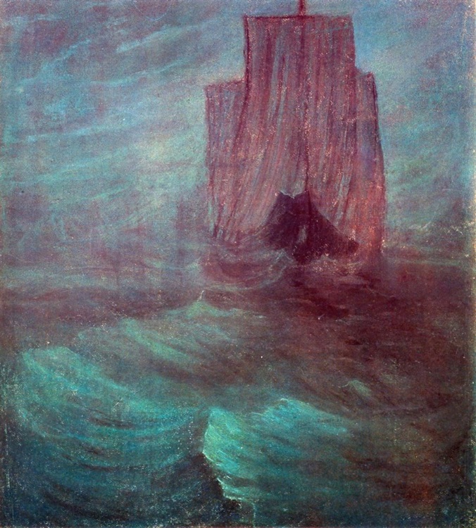 波涛在汹涌——海风在呼啸,桅杆在弓起了腰轧轧作响。下面是比蓝天还清澄的碧波,上面是金黄色的灿烂的阳光……而先民们,不安的,在祈求风暴,仿佛在风暴中才有着安详……
