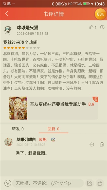 当时正好看见他说自己生病了,书评区一堆骂评,想着生病了还看着那些东西挺难受的,就把东西搬了过去,自己却不清楚自己有几斤几两,配得上那么优秀的评论,把我当粉丝刷钱,全过程毫无尊重可言。