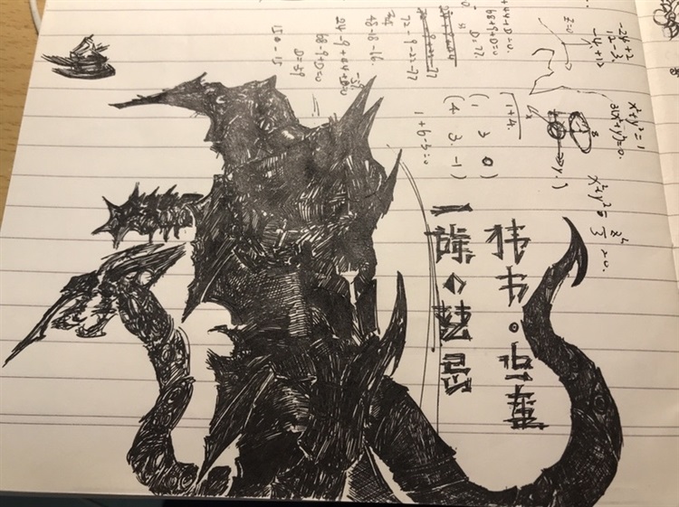以及翻出来了近代史课上的涂鸦……不会画画,我真的画的像坨屎,别骂了别骂了,就大概看一下大虫子形态不是就真的是个虫子,就是说里面是虫子但是外观看就是个黑疙瘩,大概就是这么个感觉 。