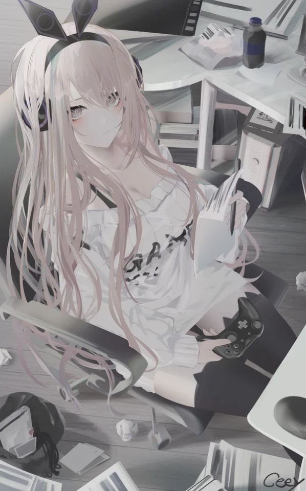 美少女身穿一套白色的T恤,T恤正前方有黑色英文字母图案,整件T恤的设计风格是露肩系列的,能看到两边的黑色肩带,让人浮想联翩。美少女头戴一副黑色兔耳头饰造型的耳机,跟萧宇打招呼的时候,她正坐在一张陈旧的电脑桌前,面前是老款电脑,美少女保持着正坐的坐姿,那双身穿黑丝长筒袜的雪白修长双腿实在白得晃眼,让人移不开视线,她右手握着黑色游戏手柄,左手拿着一张白纸清单在忙碌,装扮风格接近于游戏宅女。