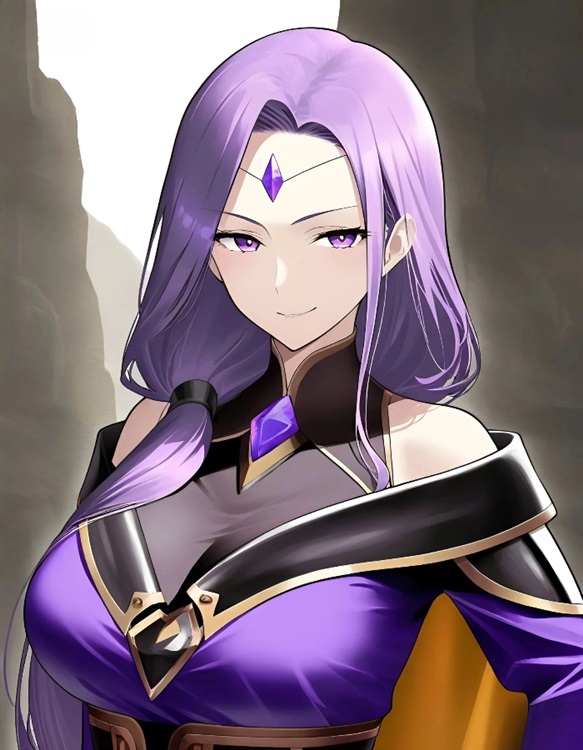 她长着一头长及臀部的柔顺紫发,发梢仿佛染着星辉,高挑曼妙的身姿,一身剪裁独特、露出肩颈和部分腰腹的深紫色制服,外罩一件饰有暗金纹路的华贵黑绒披风,面容成熟美艳,眼角微微上挑,带着一种玩世不恭的邪气,嘴角噙着一抹似笑非笑的弧度,最引人注目的是她额心处,一枚小小的、如同竖眼般的暗紫色晶石,正与脚下术式同步闪烁着妖异的光芒。