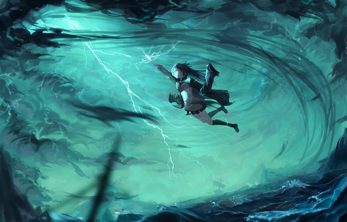 少女艺飞入高天,她举起双手瞬间狂风大作,乌云密布暗紫色的电弧在其间游走带着毁灭与狂躁的气息。