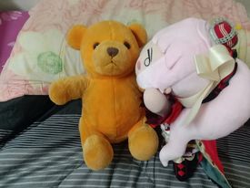 左邊那隻是咱最可愛的熊寶寶,只要把她顏色變成五顏六色的就是七彩拉!至於右邊那位嗎?我老婆(笑