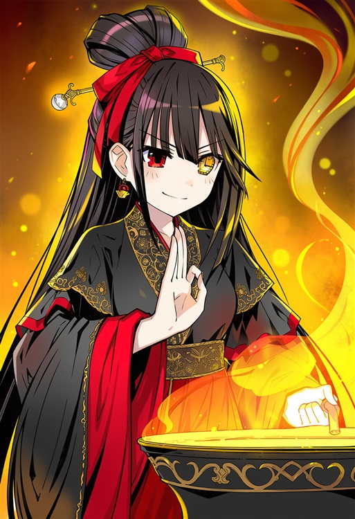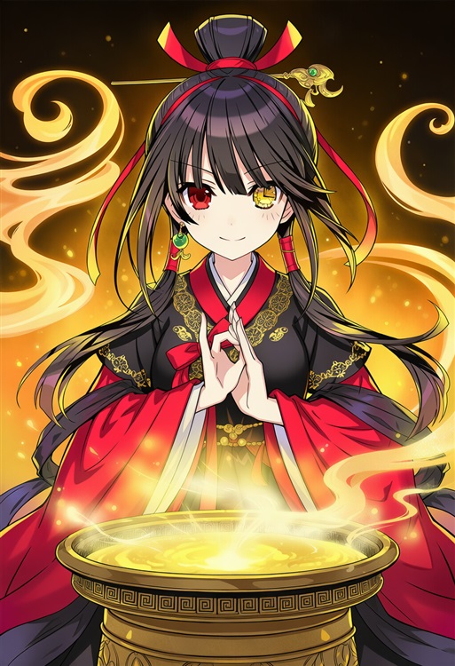她的发梢用朱红丝绦高高束起,耳边坠着细小的玉铃。随着她抬手掐诀,铃声轻轻作响,空气中荡开阵阵香气,她正神情专注地操作着面前的古铜炼丹炉。