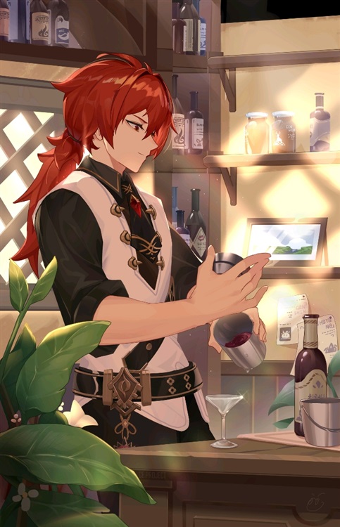 “你来干嘛?如果是喝酒的话不好意思今晚只有葡萄汁。”冷傲的声音从身后传来来者一头火红如同晨曦般的头发,后背还留有一袭狂野的马尾,赤焰般的双瞳,冷酷的表情,除去白衬衫一身漆黑,穿着件贴身黑色风衣腰间挂着火元素神之眼。