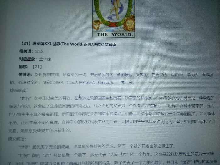 女孩儿说,塔罗牌,世界牌代表了完美的成果,也是阶段性完任务的完成。也是一个新的开始。也随之诞生了。世界排到21号,是最后一个数字,就是代表人间世界的一个数字哟。你是大人未来有一个完美的总结。而且世界牌也代表了新世界的所有一切,充满了无限的可能哦。也是面对前面一张审判之后的创生。我抽到的就是审判牌哦。这一定就是命运啦。