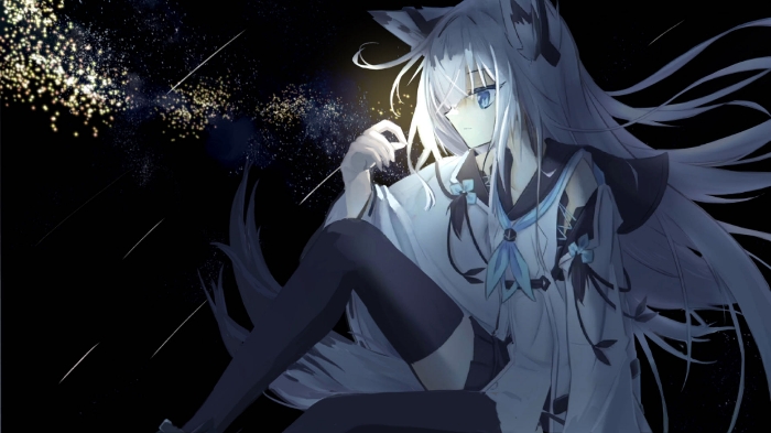 按钮:“你满意啦?!”狐小白看着掉落的按钮一下慌了神(对不起!对不起我不是故意的…)狐小白连忙蹲下捡起那掉落的按钮试图重新安回去,没研究过开关结构的狐小白怎么可能安的上去只能一次又一次的使劲按,被大力按压的开关一次又一次掉了下来,最终在第四次往上安的时候它想开了,按钮断裂成了两块掉落在了地上…按钮:“你满意啦?!”眼见事态无法挽回的狐小白连忙逃离了这个房间,跑到了走廊上…漆黑的走廊上静悄悄的,只有狐小白走动的咚咚声,狐小白在走廊上能非常明显的看到有一处地方撒落着月光,狐小白朝着那个地方走去…只见面前出现了一个向上的楼梯,狐小白朝那边望去看见一个一整面的玻璃窗框镶嵌在墙壁中,木制的窗框上面镶嵌着许许多多玻璃有的早已脱落(这个地方能看见月亮吗…),狐小白一步步的走上了楼梯,爬到一半蹲坐在了那一整面的玻璃窗前望向了窗外的月亮…“今晚的月亮好圆…”月光照在了狐小白的身上,狐小白的瞳孔中出现了一个白色的月牙,身上也在发生着肉眼可见的变化,白色的头发变得更长了起来,全身都开始在“长大”身上的衣物被白色的光芒包裹,白色宽大的振袖连接的水手服替代了原来的女仆装,领口处系上了一条青色的领带,纤细的手上套上了黑色的手套,女仆装的长宽裙也被替代成了黑色的超短裙,腰间也出现了一把白色刀鞘的佩刀…