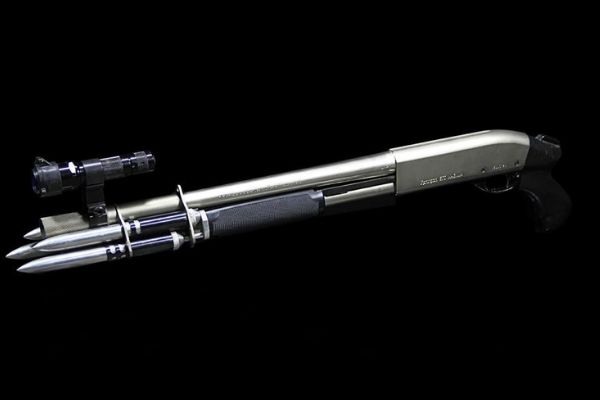 沃森干脆溜进仓库内侧,开始参观吸血鬼猎人的武器。不得不说,这帮人也不知道是从哪里来的脑洞,可以把普普通通的枪械全部魔改掉。就比如这支无托版莫斯伯格500霰弹枪,就被改装成了枪口发射银质钉头的版本,和电影里一模一样。