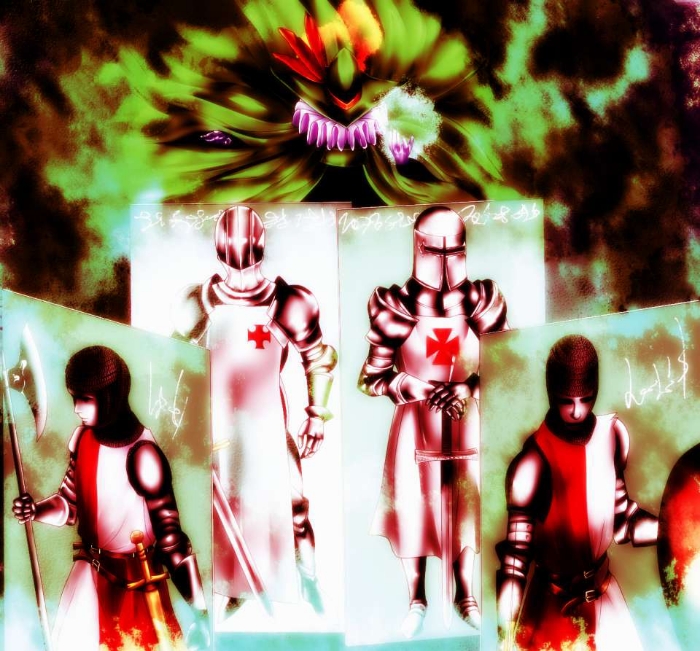 而指挥着这一支骑士军团的魔王,则以将领的姿态位居中心。附有羽毛装饰的厚重帽子和他的头部融为一体,全身褶领耷拉着下垂的披风,看上去没有任何支撑用的躯体,铜绿色的火焰诡异地飘荡在四周,仿佛是一个飘荡着的幽灵。