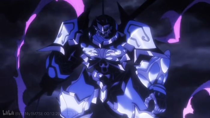 以深厚的黑色作为打底,黯淡的银色铠甲遍布浮雕般的花纹,犹如融合成身体的一部分般装备在了修德南全身。也许任何人只是接触的瞬间无疑就能够意识到吧,这副铠甲有着远超金属的硬度,似乎用世上最锋利的矛和剑来破坏甚至都留不下刮痕。明显保留有部分兽类特征的头盔只透露出了一枚杀气腾腾的左眼。从肩甲上处的缝隙中伸出的两条紫色的布带如风中旌旗般飘舞,一尊威严的杀神赫然眼前。