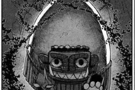 她谨慎地架起兵刃,看见被自己击退的萨拉卡埃尔身形发生了变化,变成了另一副模样。从外形上,那看上去像是一颗人类大小的蛋卵,全是装饰着绳结饰品和条带,正中间的“脸”上还贴着三张近似魔怪、老人、妇女的鬼面。