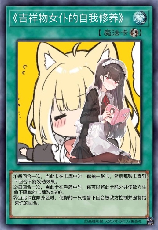 “发动「某不知名的异教」一效果。当我方场上没有怪兽,且对方场上有两只或以上的怪兽时才可发动,我将一张卡送入墓地,我选择将这张「吉祥物女仆的自我修养」送入墓地,然后特殊召唤此卡并守备表示。”