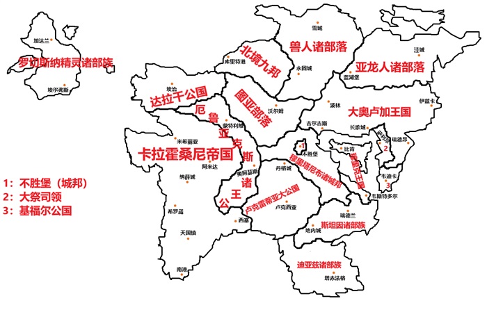 这是截止至卡拉霍桑尼帝国建立后75年的帕塔兰德政区图概览,包括图亚部落在内的大部分地区由于政权过于零碎而笼统表示。