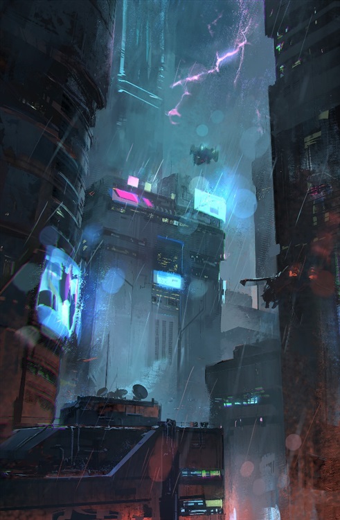 蕾樂斯獨自一人坐在天台的邊緣,拉上兜帽看著下雨的城市。