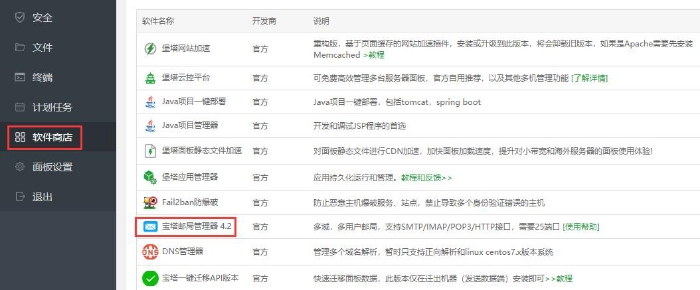 1、在宝塔的软件商店里安装邮局管理器: 打开宝塔左边侧栏的软件商店,安装即可。